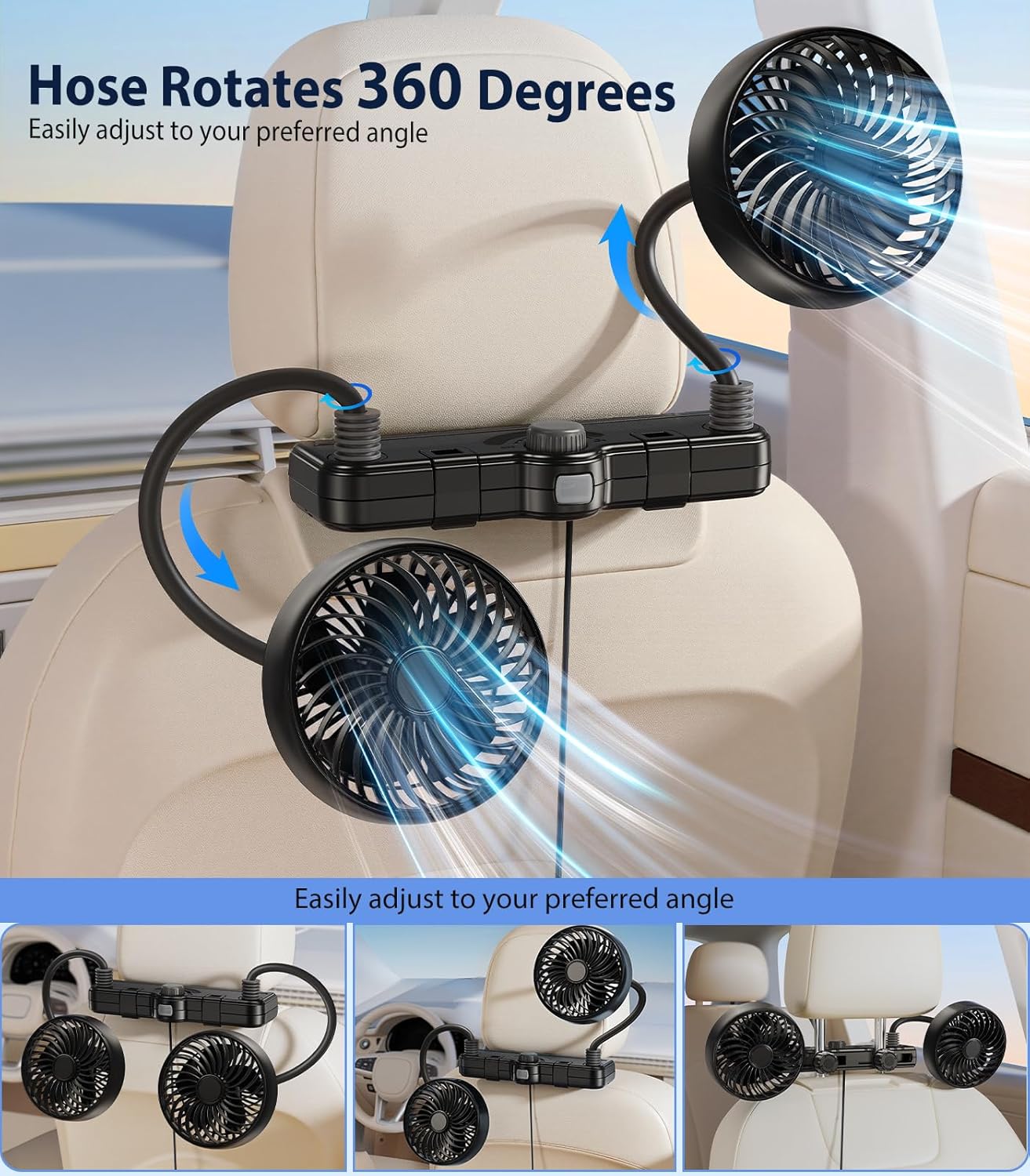 3 Geschwindigkeitsstufen: Mit 3 Geschwindigkeitsstufen – niedrig, mittel und hoch – können Sie den Luftstrom des Autoventilators für die Rücksitze an Ihre Vorlieben und die Wetterbedingungen anpassen.