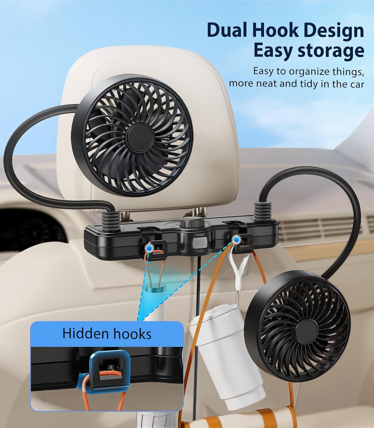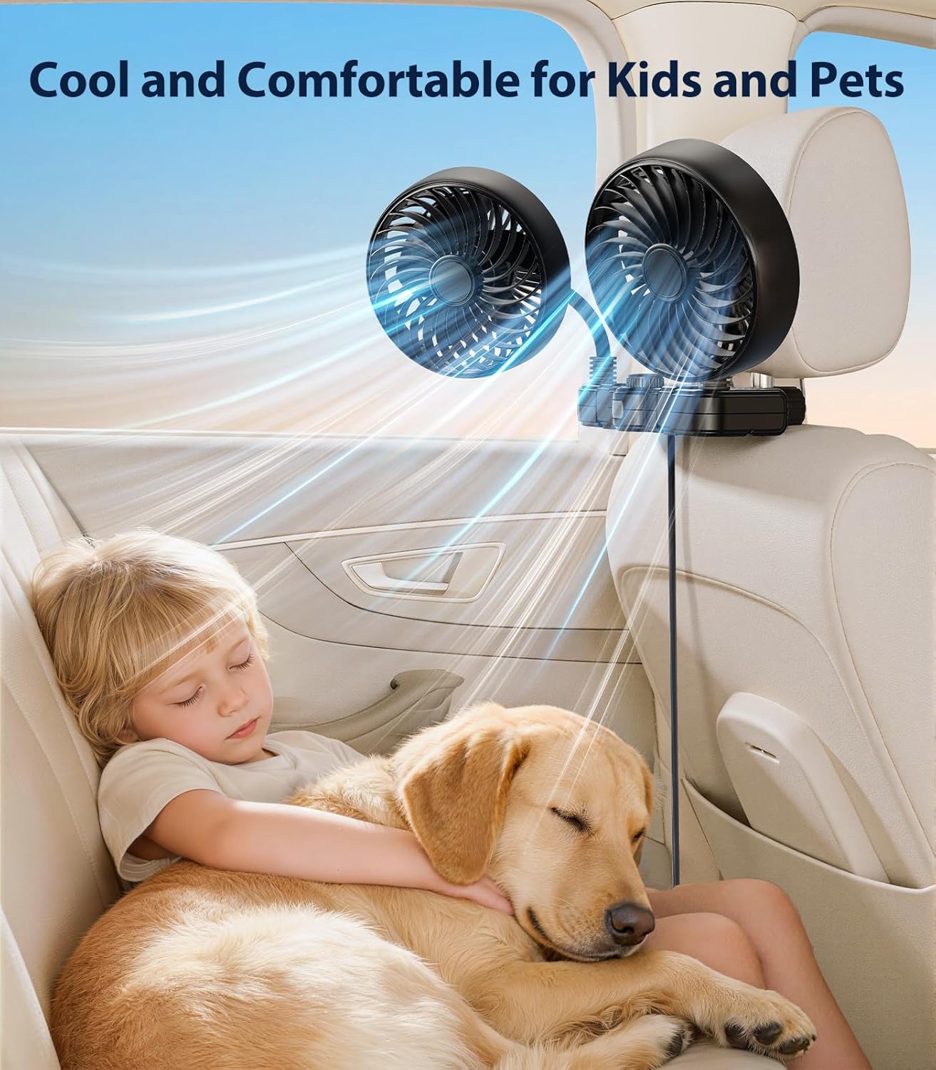 Doppelte Kühlleistung: Der Doppelkopf-Autoventilator ist mit 5-Blatt-Vortex-Luftstromtechnologie und einem bürstenlosen Motor ausgestattet, der einen stärkeren und gleichmäßigeren Luftstrom bei geringer Geräuschentwicklung und langer Lebensdauer erzeugt. Er ist ideal für lange Autofahrten oder Roadtrips mit Familie und Freunden an heißen Sommertagen.